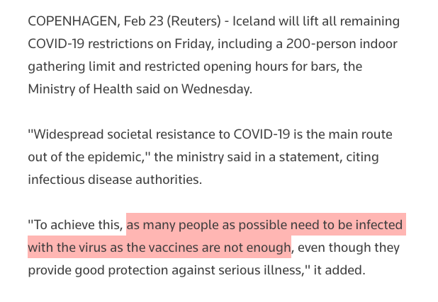 | Brainstorm | LjL, It says: COPENHAGEN, Feb 23 (Reuters) - Iceland will lift all remaining COVID-19 restrictions on Friday, including a 200-person indoor gathering limit and restricted opening hours for bars, the Ministry of Health said on Wednesday. "Widespread societal resistance to COVID-19 is the main route out of the epidemic," the ministry said in a statement, citing infectious disease [... want %more?] | 20:04 |