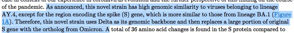 | Brainstorm | LjL, It says: Per ana e ROeN Te nn aE aN e MR aa ANOLE ER NL eae ee Na A Ue TT eae A OnSite oN N eT eine of the pandemic. As announced, this novel strain has high genomic similarity to viruses belonging to lineage AY.4, except for the region encoding the spike (S) gene, which is more similar to those from lineage BA.1 (Figure 1A). Therefore, this novel strain uses Delta as its [... want %more?] | 21:46 |