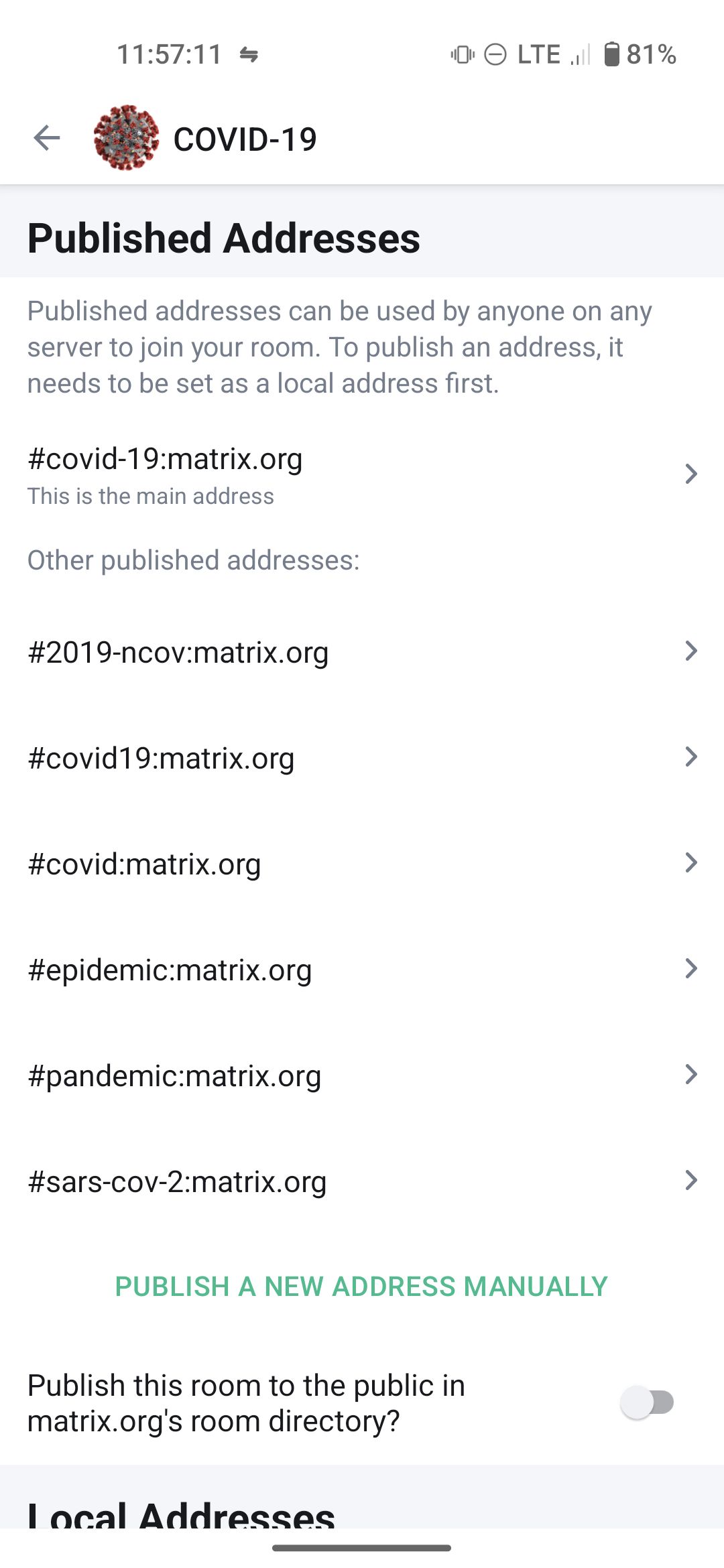 | Brainstorm | (Matrix) <LjL> Raf: WTF, I see now why so few people have joined this room recently (Matrix side)... look at the rooms that show up if you search for "covid". This one definitely used to show up. I know that Matrix has "curtailed" new rooms showing up in search due to... problems... but, seriously, wtf? | 04:47 |
