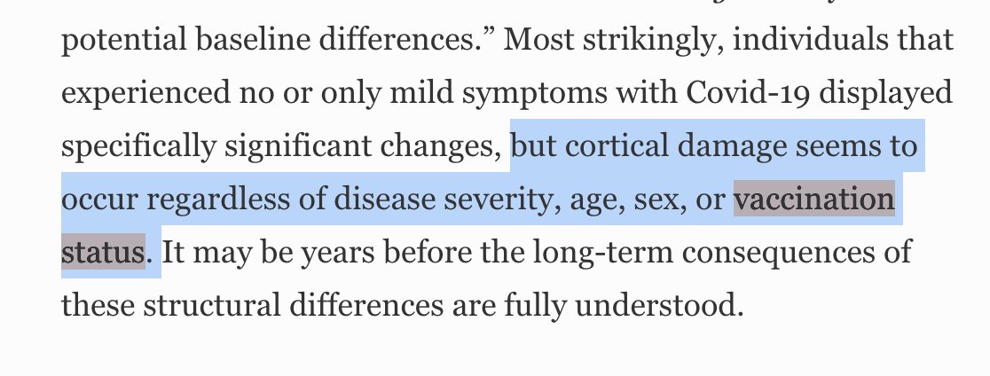| Brainstorm | LjL, It says: potential baseline differences.” Most strikingly, individuals that experienced no or only mild symptoms with Covid-19 displayed specifically significant changes, but cortical damage seems to occur regardless of disease severity, age, sex, or vaccination status. It may be years before the long-term consequences of these structural differences are fully understood. | 20:04 |